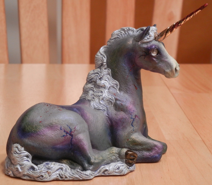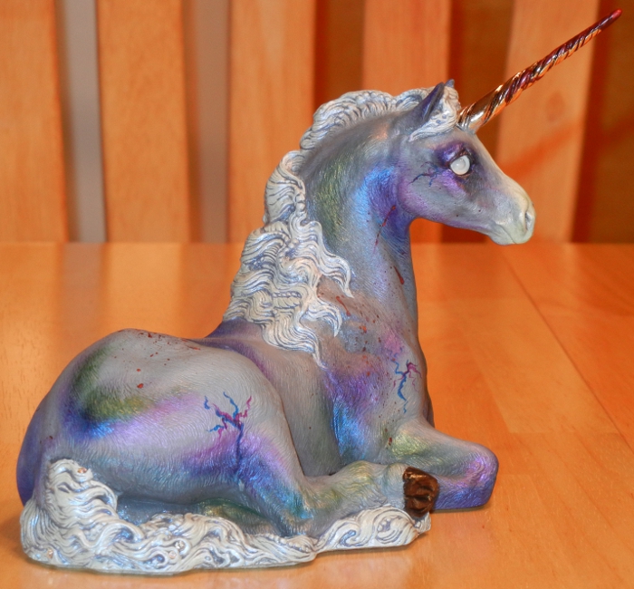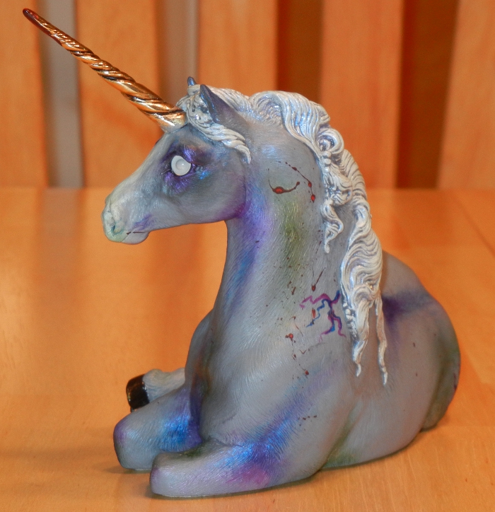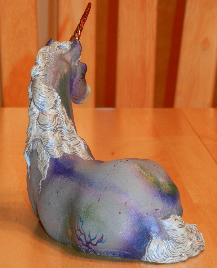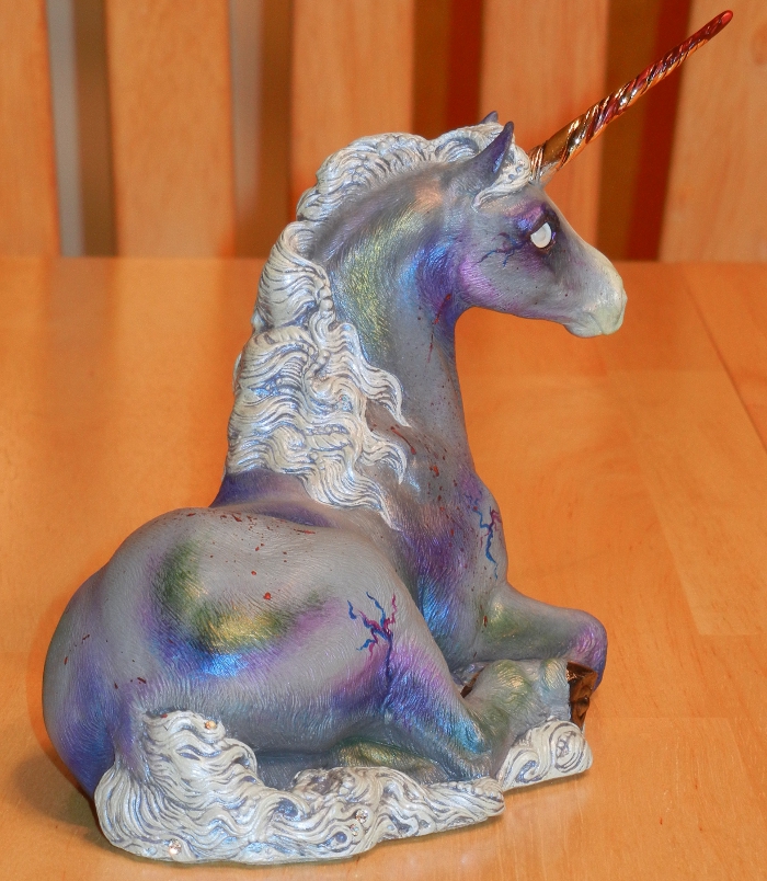 She is, like most of my other unicorns, given a matte topcoat but her mane, tail and hooves have been separately glossed. She has a few random crystal colored and AB colored Swarovski gems in her mane and tail, and her horn is stained with the fresh blood of her last kill – this has been given a glossy topcoat to keep it adhered to the horn. She has an ice blue mane and tail which is also interferenced in blue – it’s impossible to take pictures of it, but it looks awesome in person. Her gray skin is “bruised” in green, blue, and violet, and she has been given blue, violet, red, and gold interference.
