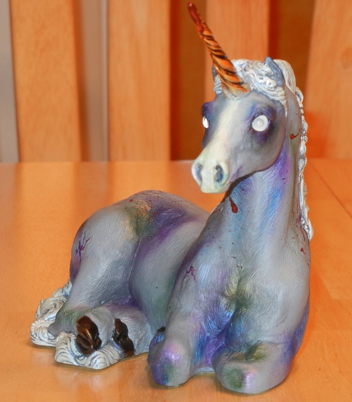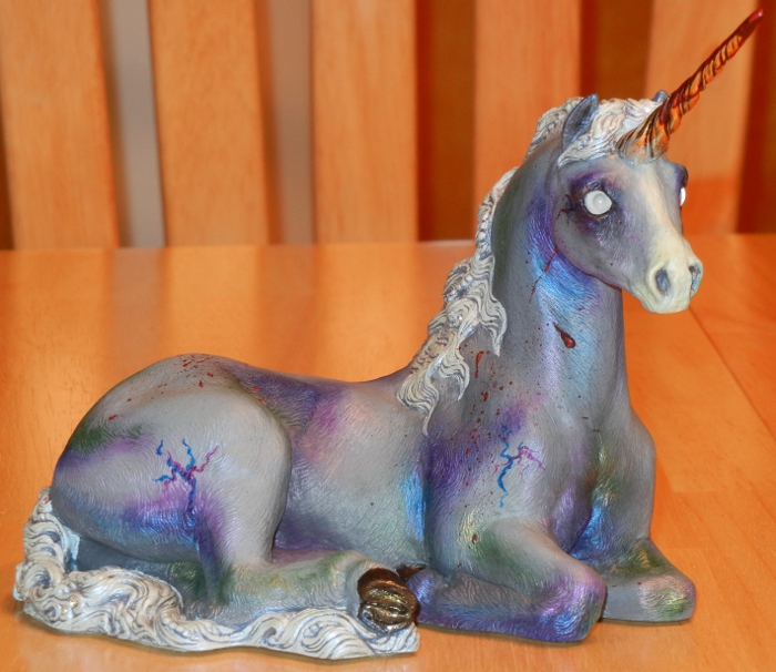So in between my progress in fixing an emperor (whew!) I have been painting this little lady… A ZOMBIECORN!! Rofl!! I got some brand new glass custom eyes from Tohickon Glass in the mail the other day, and they are zombie eyes – they’re fantastic! I just had to paint something, and I figured I’d never tried a unicorn before 🙂
