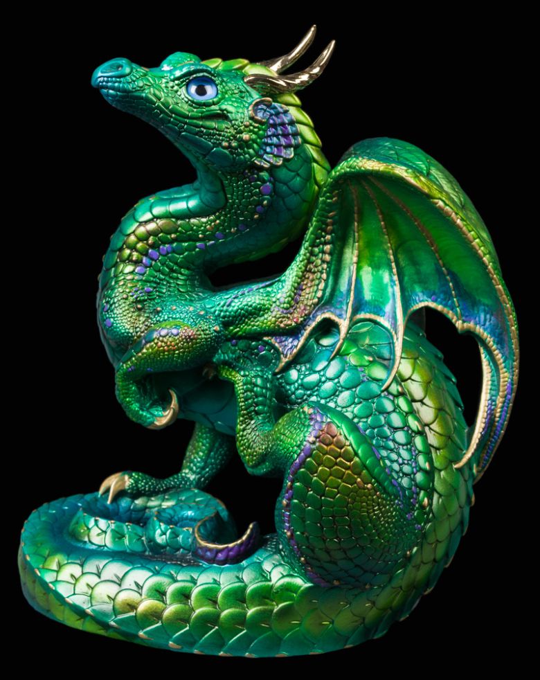 The raffle prize for March 2026 is a Spring Green Scratching Dragon airbrushed in teal, green, and blue with purple trim. Gold detailing highlights its claws, wing edges, and select scales. It has two gold plated pewter horns, blue glass eyes, and a satin finish.