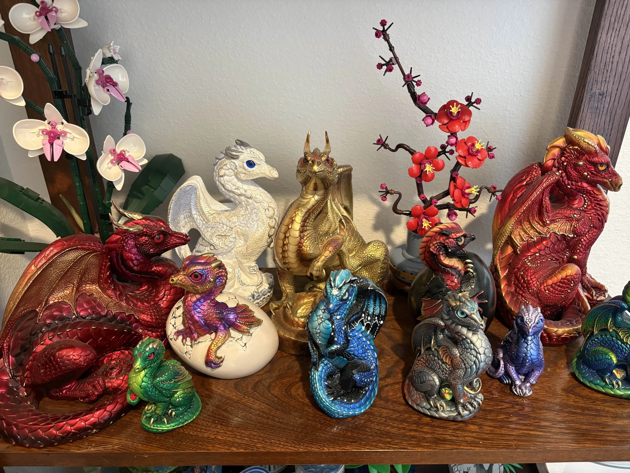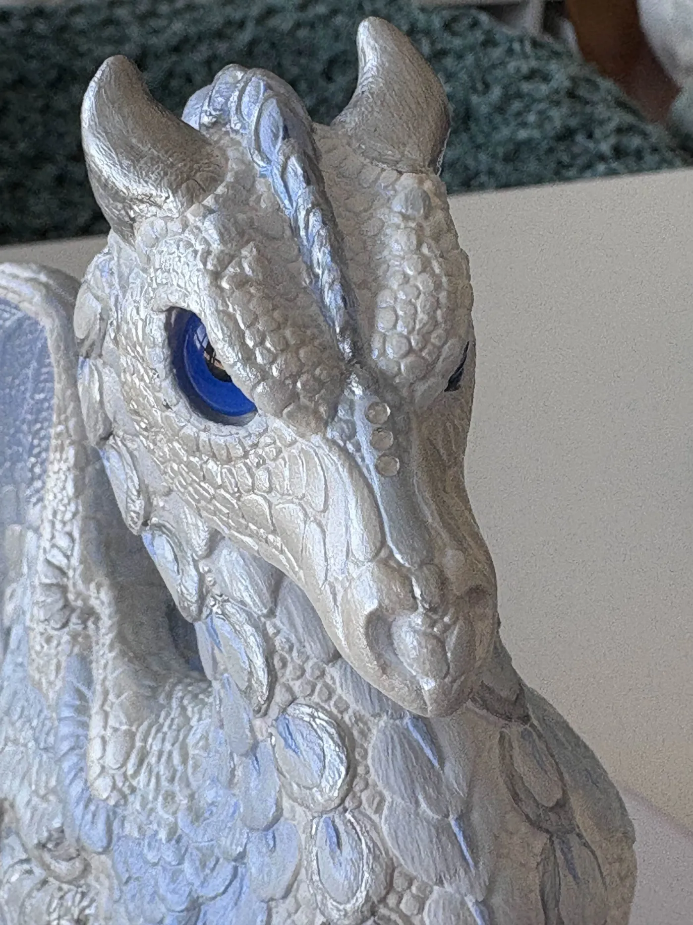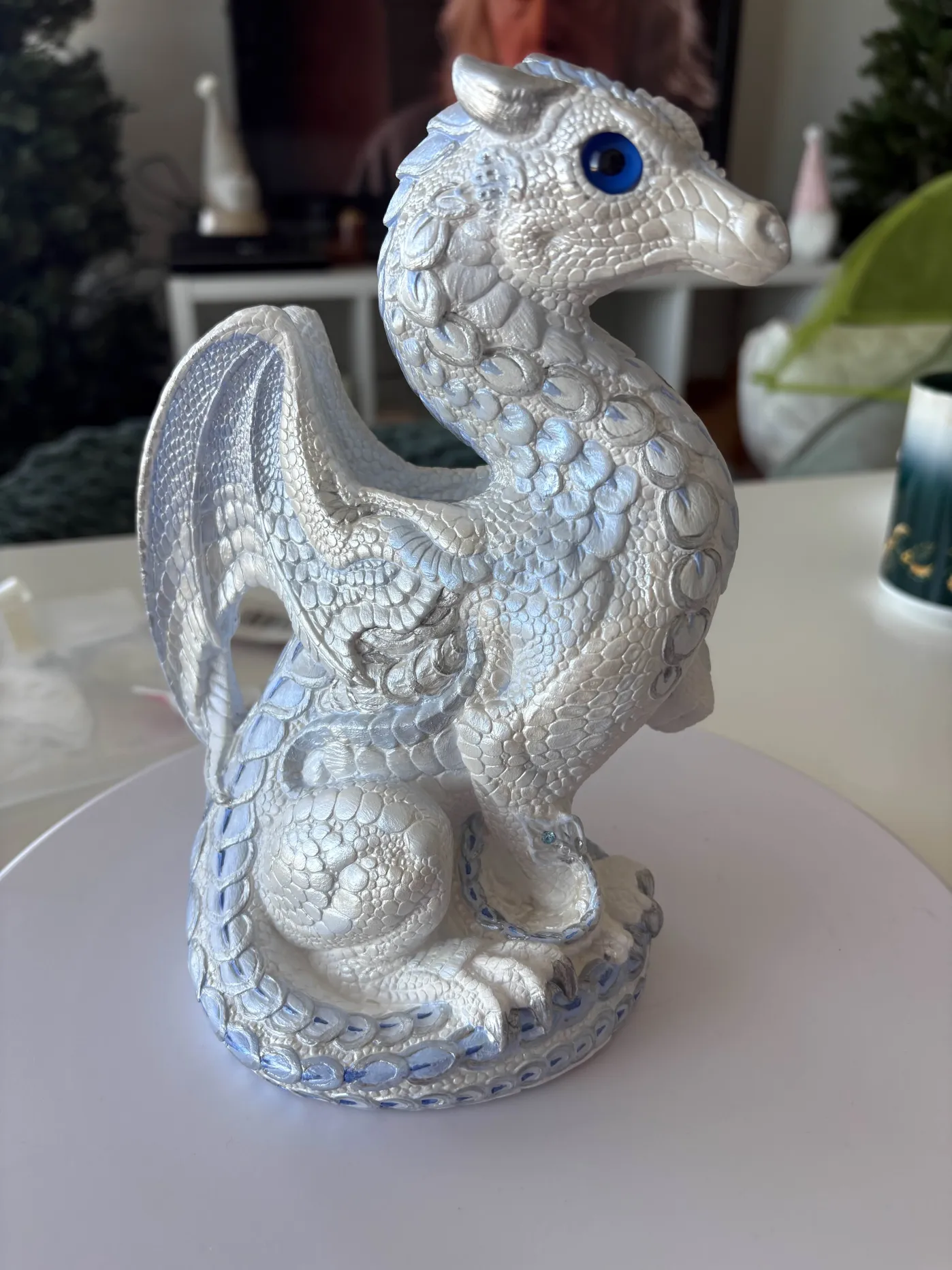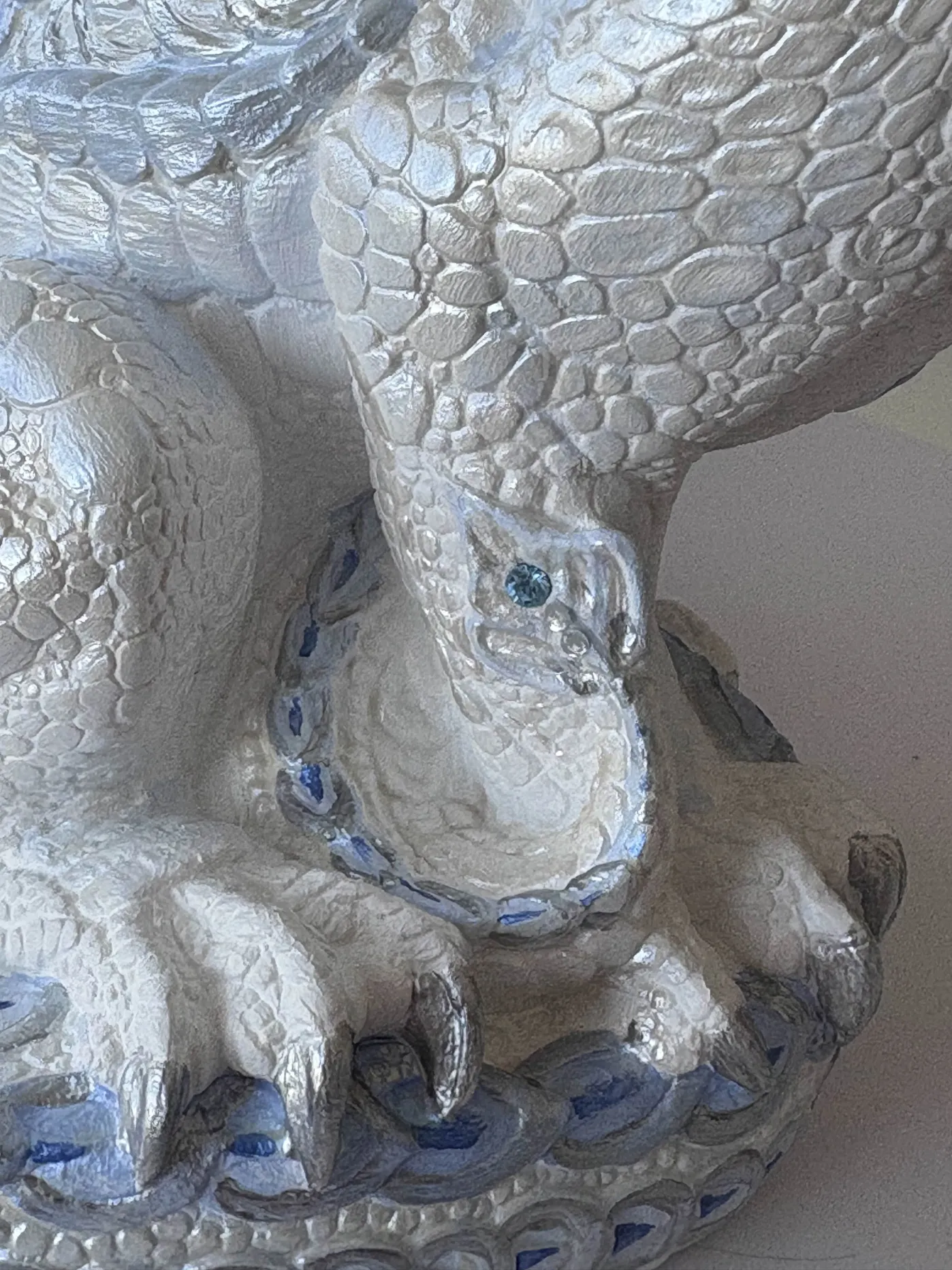 I had always intended a more ‘ice dragon’ motif, and I added a few additional crystals I had on hand. I ended up using a pearlescent blue and white/silver along with some straight silver paint on top of the white basecoat and slowly adding in bright blue to my white so I could build up the cold look. I’m incredibly proud of this, I’ve never painted a sculpture like this, but I am so happy with how it came out, and how it looks among the rest of my collection. 🙂