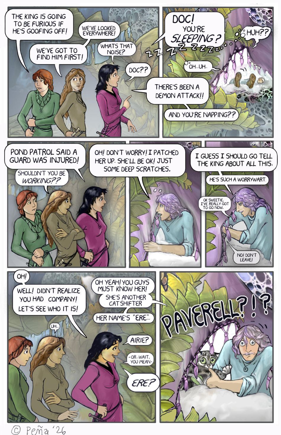 Melody says, “Back to King Serence’s camp.” [When last seen Kade, Ere, and Podge had been drinking “sparkle juice” (page 202)].