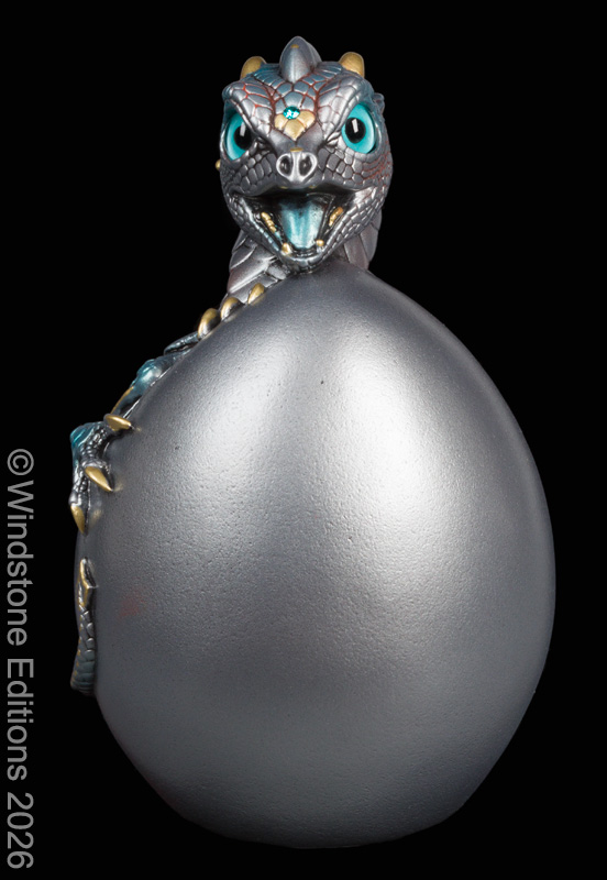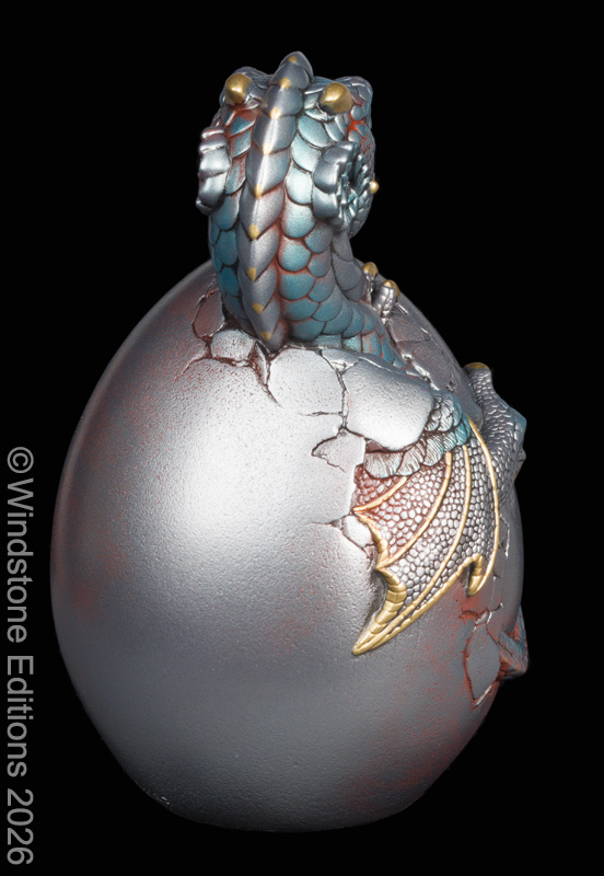 This Hatching Emperor is airbrushed in “Ancient steel”. Gina invented this color as another way to enhance and beautify the less-than-perfect castings we have accumulated over the years! Waste not, want not. This dragon looks as if he is wearing battle-hardened old armor. His large scales are polished silver, and blue. He has touches of rust-colored antiquing. Each one of these is slightly different, because of different defects, and the way the rust colored antiquing was applied. They have metallic teal glass eyes and blue zircon colored jewels set in their foreheads. Unsigned Limited Production. He is about 6 1/2″ inches tall and 4″ long.