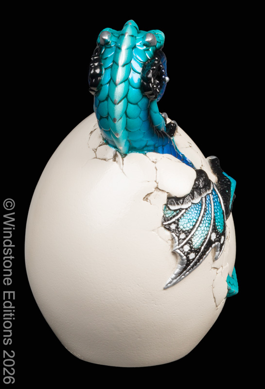 He is about 6 1/2″ inches tall and 4″ long. This Blue Morph colored Hatching Emperor has light aqua glass eyes and a clear colored crystal in his forehead to match the other Blue Morpho dragons. These are unsigned limited production, only available directly from us.